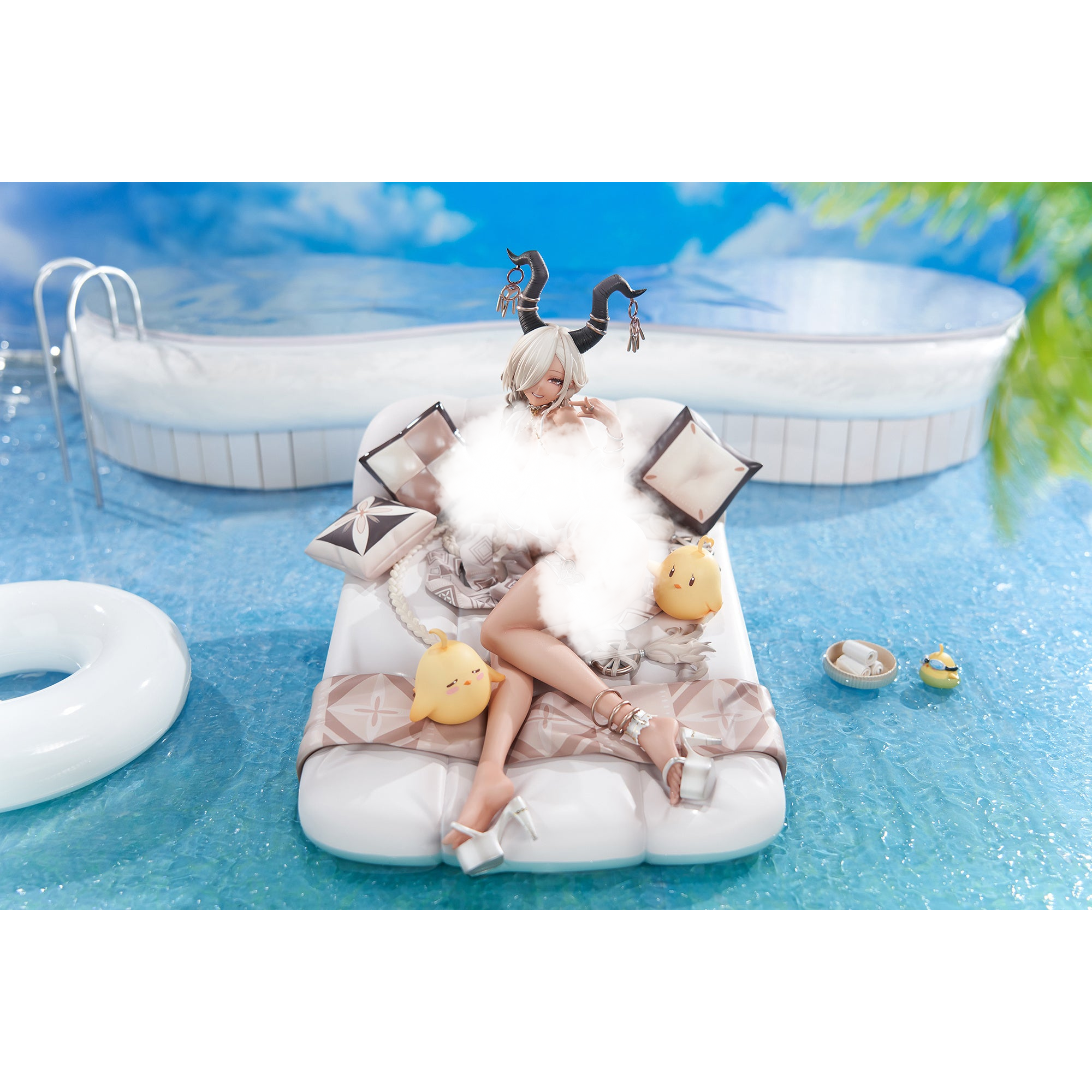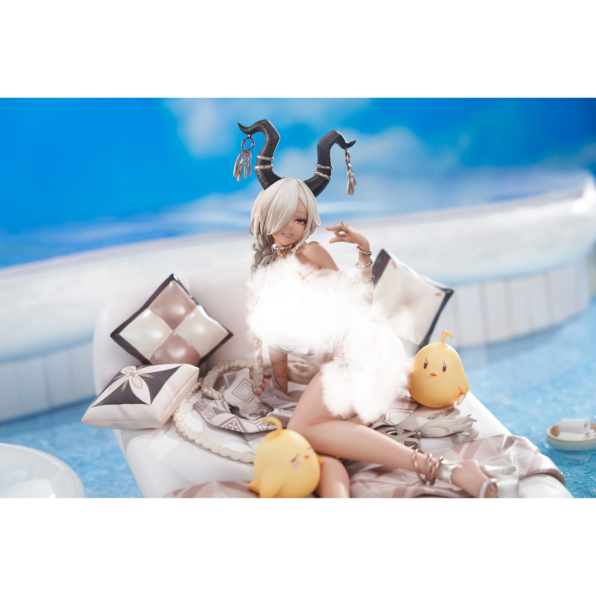 Owari, a Kii-class battleship from the hugely popular app game "Azur Lane," is now a gorgeous figure from Apex in her "Shimmering Forsythia" skin! Her barely-there swimsuit is the perfect color to show off her tanned skin, and her waterbed and the Manjuu mascots are perfectly crafted to faithfully reproduce the illustration! Her sparkling necklace is carefully made to express its texture, and it's made of metal for a true-to-life finish. She also has two additional interchange faces: a mischievous expression and a "heart eyes" expression! As a special bonus, a full-color pinup of the illustration that inspired this figure will be included only with the first run of this figure! (This item will only be included with the first run of this figure; if yours does not include it, it was not part of the first run.) Order her for your own collection today!