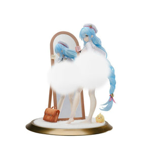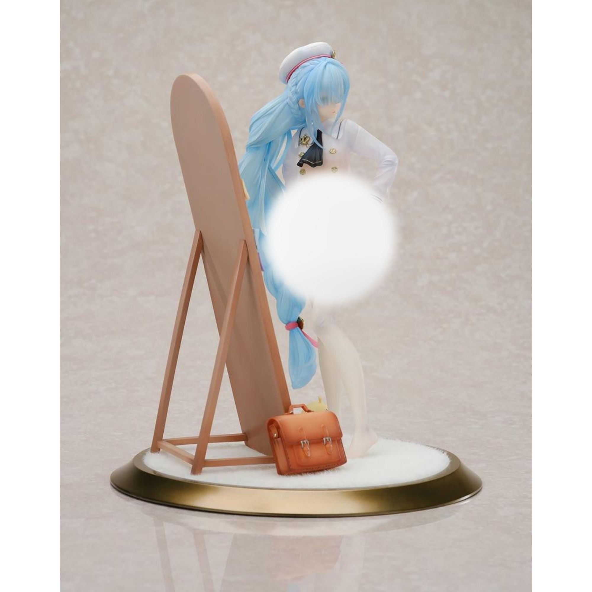 Janus, the Royal J-class destroyer from the hugely popular app game "Azur Lane," gets a new figure from Apex featuring her "Fear of Changing ... Clothes" skin! She's seen getting dressed in front of a mirror; the school book bag and Manjuu mascot at her feet can be placed wherever you like. Her outfit and her distinctive blue hair are made with clear materials for a translucent appearance; her base features a soft, furry surface! In addition to her slightly surprised expression, she also has two more interchangeable faces: a smile with closed eyes, and a sulky expression. A full-color pinup of the original illustration that inspired this figure is also included! Order her for your own collection today, Commander!