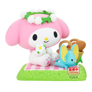 My Melody Figure (A): Depicts My Melody, the sweet and gentle white rabbit, with her signature red hood and bow. She is shown holding a basket filled with treats, embodying her caring nature.