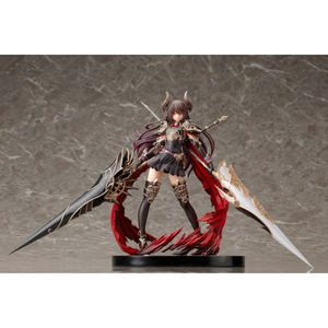 The black and silver armor, gigantic black and white lances in each hand, and tattered cloak fluttering in the wind combine to give the figure a sense of the overwhelming strength and pride of the dragoons. On the other hand, one of Forte’s greatest charms is her harsh expression, juxtaposed with her cute appearance.