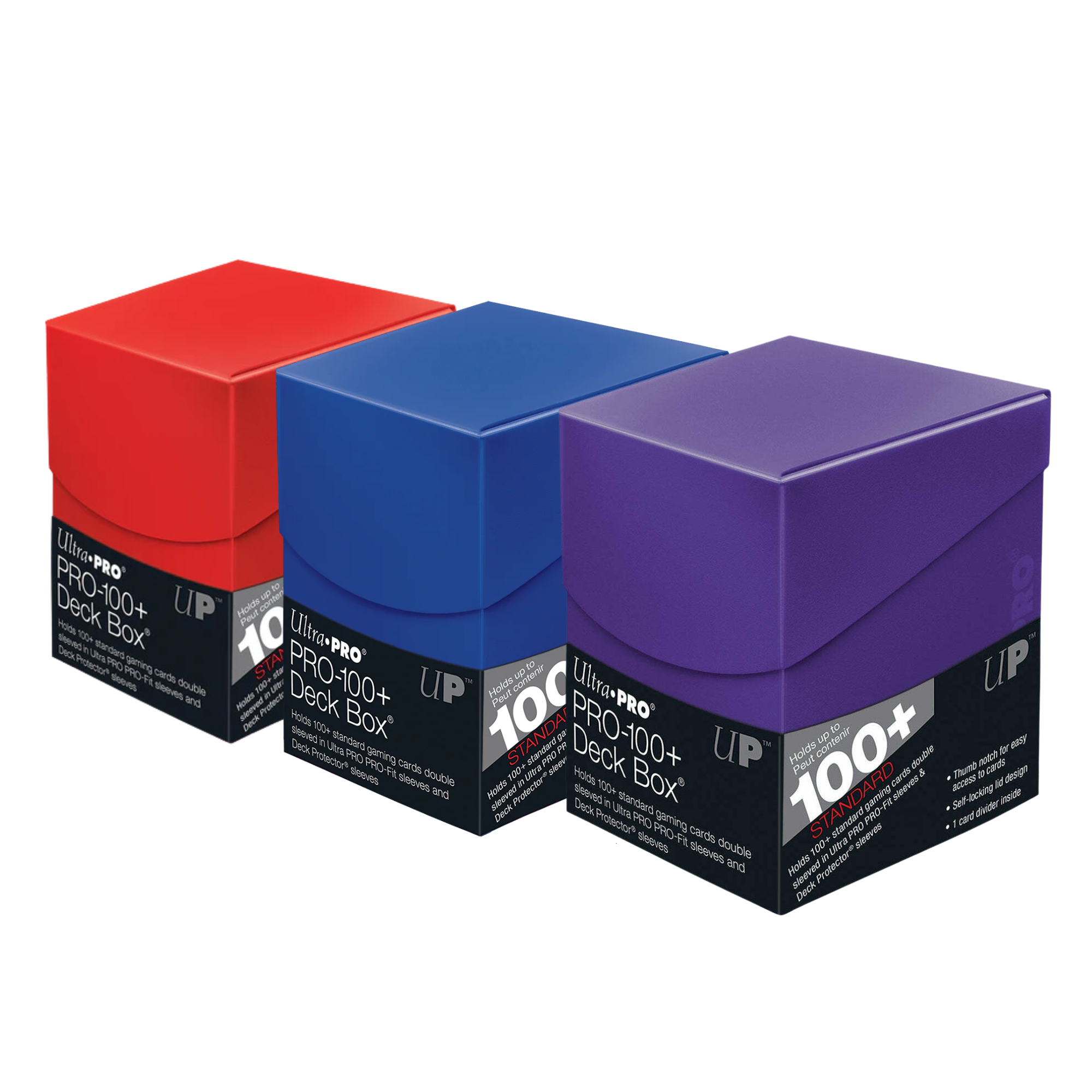 Holds up to 110 Standard gaming sleeved cards. Self-locking lid design with thumb notch for easy access to cards.(sleeves, cards not included)