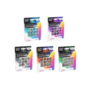 This set contains 12 six-sided dice of 16 mm size. The Galaxy range is the exciting fusion of two or more cosmic colors, creating unique looks with the addition of glittering elements. They are packed in a window cardboard box that displays all dice at the front.