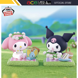 My Melody Figure (A): Depicts My Melody, the sweet and gentle white rabbit, with her signature red hood and bow. She is shown holding a basket filled with treats, embodying her caring nature.
