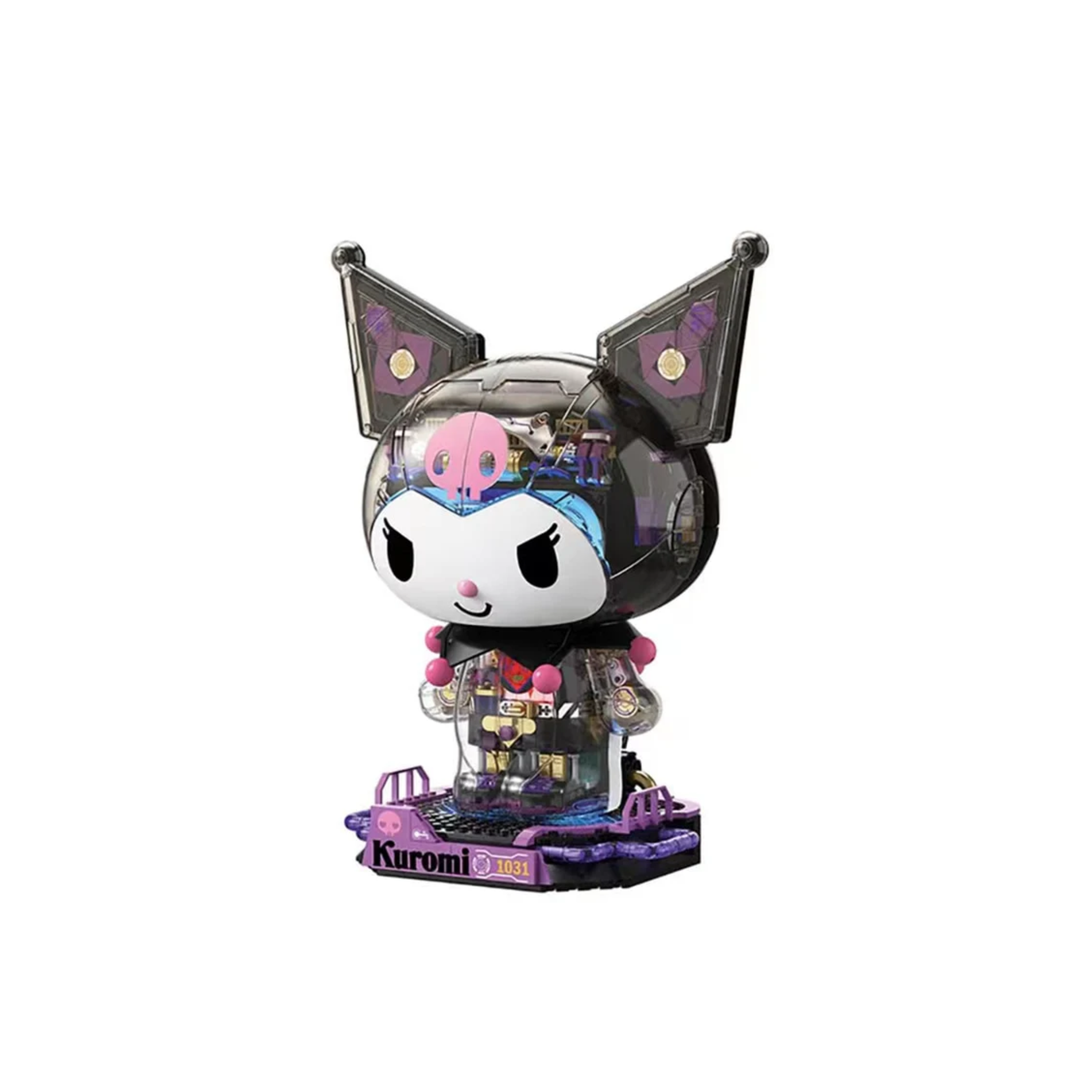 Introducing the Kuromi Half Mechanical Block Figure by Toptoy - the ultimate fusion of mechanical wizardry and artistic brilliance! This figure boasts a half-mechanical design, showcasing robotic components on one side of Kuromi's face and body. The mechanized bits illuminate with battery-included LED lights, adding an extra level of flare to the figure. With over 1000 pieces, this intricate figure is the perfect blend of technology and aesthetics and will be a stunning addition to any collection.